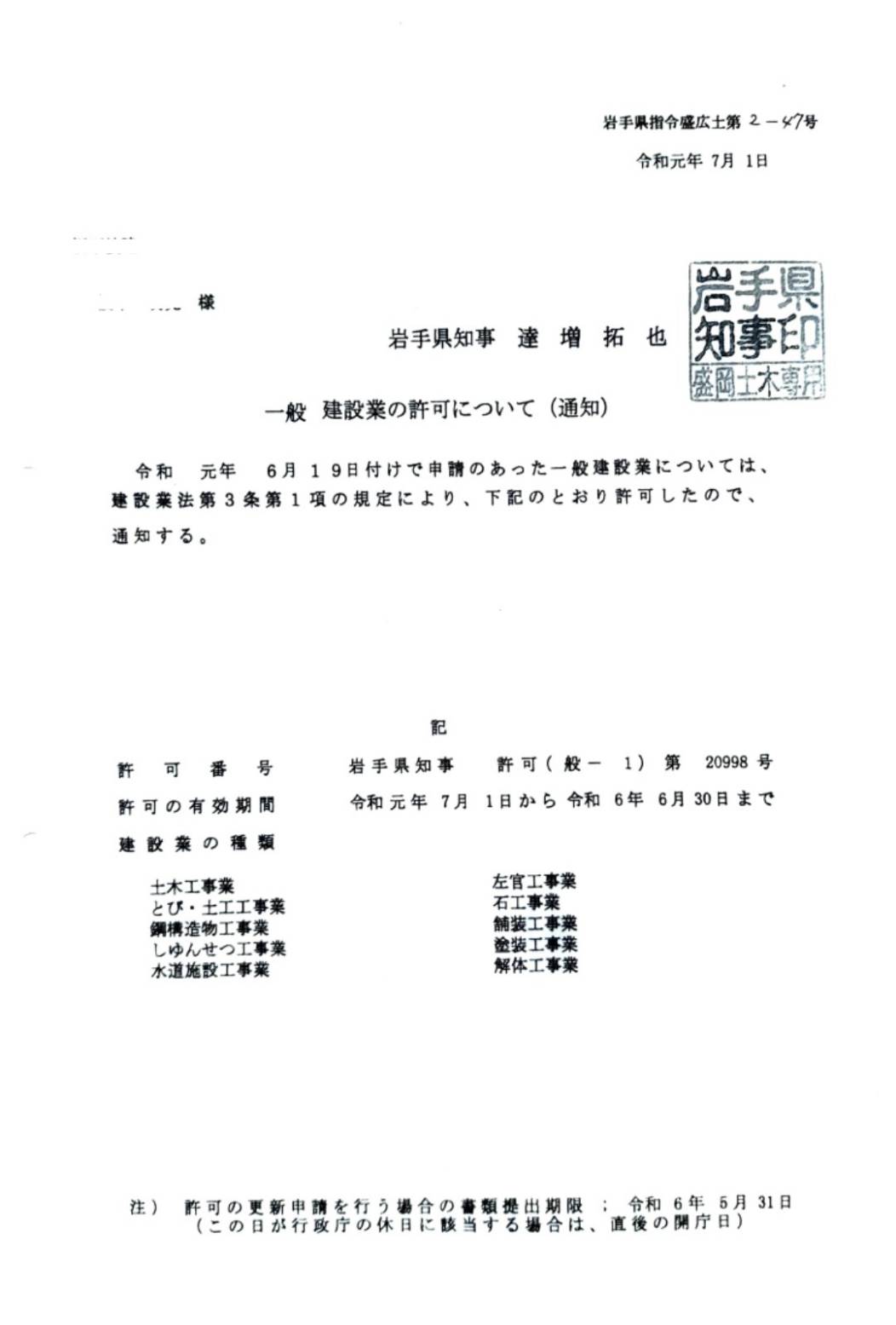 建設業許可通知書岩手県滝沢市の建設業者様(建設業許可更新)