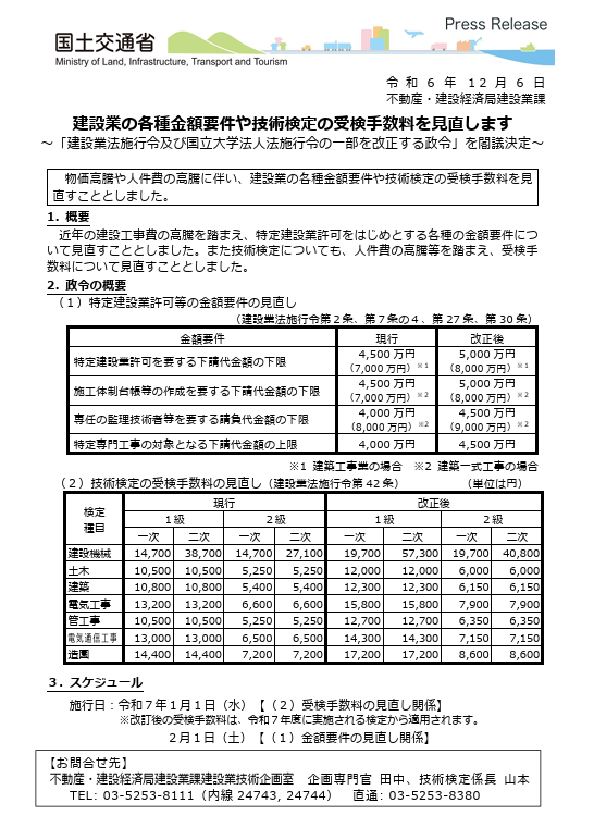 また、技術検定についても、人件費の高騰等を踏まえ、「受検手数料の見直し」に関する政令が令和7年1月1日から施工されます。※改訂後の受検手数料は、令和7年度に実施される検定から適用されます。