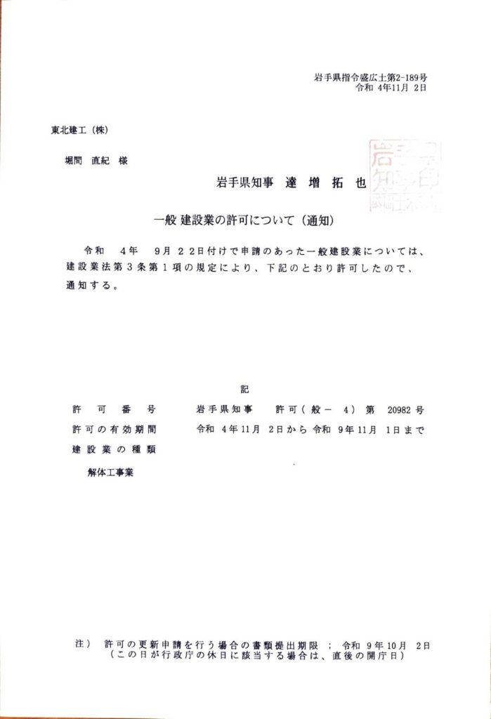 岩手県 盛岡市 解体工事業登録 岩手県 盛岡市 解体工事業登録 大工工事業 左官工事業 等 岩手県知事一般建設業許可 土木一式工事 等 電気通信工事 建設業許可 岩手県 盛岡市 建設業許可 岩手県 盛岡市 とび・土工工事業 建築一式工事業 解体工事業 塗装工事業 土木一式工事 等 電気工事業 土木一式工事業 等 塗装工事業 管工事業 とび・土工工事業 塗装工事業 塗装工事業 建設業許可通知書 建築一式工事業 舗装工事業 解体工事業 建設業許可通知書 管工事業 建設業許可通知書 建設業許可通知書 建設業許可通知書 大工工事業 管工事業 塗装工事業 大工工事業 左官工事業 等