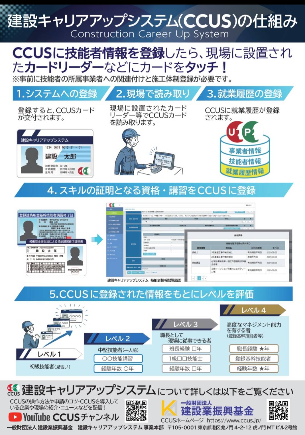 そのため、技能者の技術と経験に応じた適正な評価や処遇を受けられる環境を整備しなければならないことから、技能者の資格、現場の就業履歴等が登録・蓄積される建設キャリアアップシステムが構築されました。